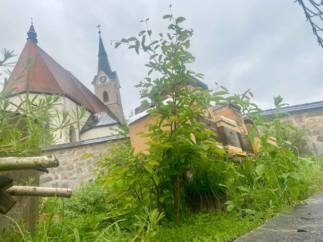 Durch die Lage vermischen sich hier meist Blütenhonig und Waldhonig. Der hinter der Mauer gelegene Friedhof ergänzt das natürliche Angebot.
